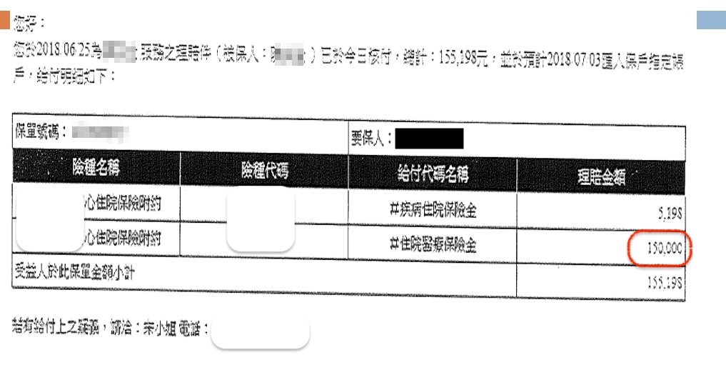 保戶買的這家人壽的住院保險附約 15計畫,實支實付的雜費限額 15萬,剛好賠到最頂了,再加上住院日額的給付,總理賠 155,198元。