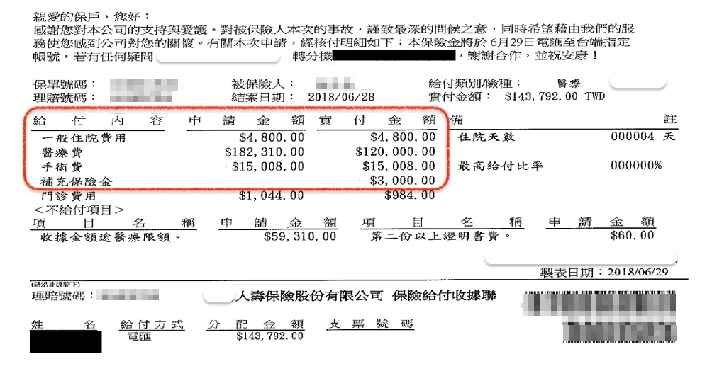 而這家人壽的實支實付買計畫二,雜費限額 12萬,也是賠到最頂了,再把住院日額、手術費與其他項目加上,總理賠 143,792元。