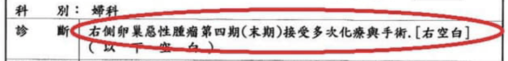 必須先確認「事故原因」也就是「傷病部位」,如「右側卵巢惡性腫瘤第四期(末期)接受多次化療與手術」,有完整的診斷病名,包含左側右側或左腦右腦。