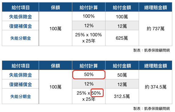 當失能第 6級時,失能分期金會打折 50%,再乘上 25年的長期給付時,可以發現到跟第 1級的總理賠額度差了一半。