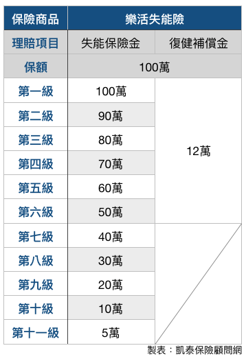 萬一不幸發生失能,除了給付失能保險金外,還有一筆復健補償金,假設保額 100萬的給付: