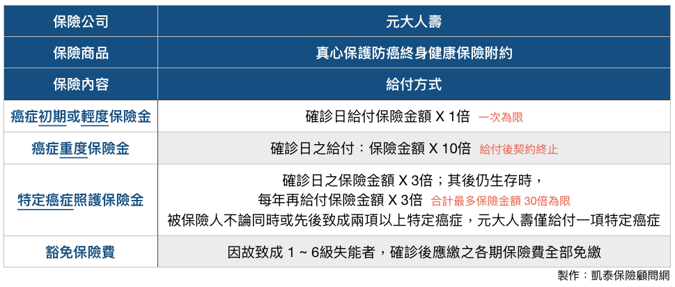 這張元大人壽真心防癌險最大的特色就是提供特定癌症的每年照護金,類似失能險的長期給付概念。