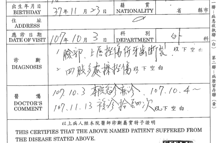 醫師診斷門牙處的斷裂,不適合用植牙,因此改裝「三顆假牙」用牙橋的方式,光是三顆假牙的費用是 66,000元。