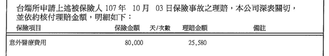 另一家額度 8萬的意外實支實付,保險公司僅理賠 25,580元(含其他門診雜費)。