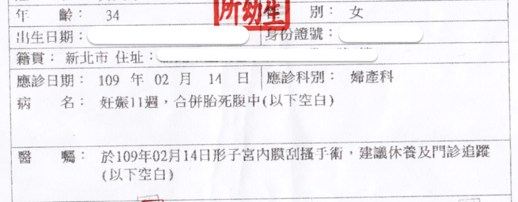 2020/02/14 妊娠第 11週無心跳,行子宮內膜刮搔手術
