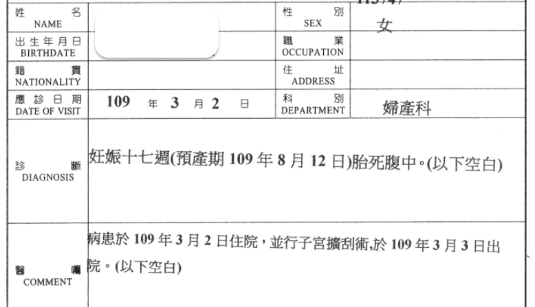 懷孕第 17週,行子宮擴刮術,住院兩日,總共自費 6,500元,包含 5,000元病房費、1,000元檢驗費、300元證明書費、40元藥品費、160元其他費用。