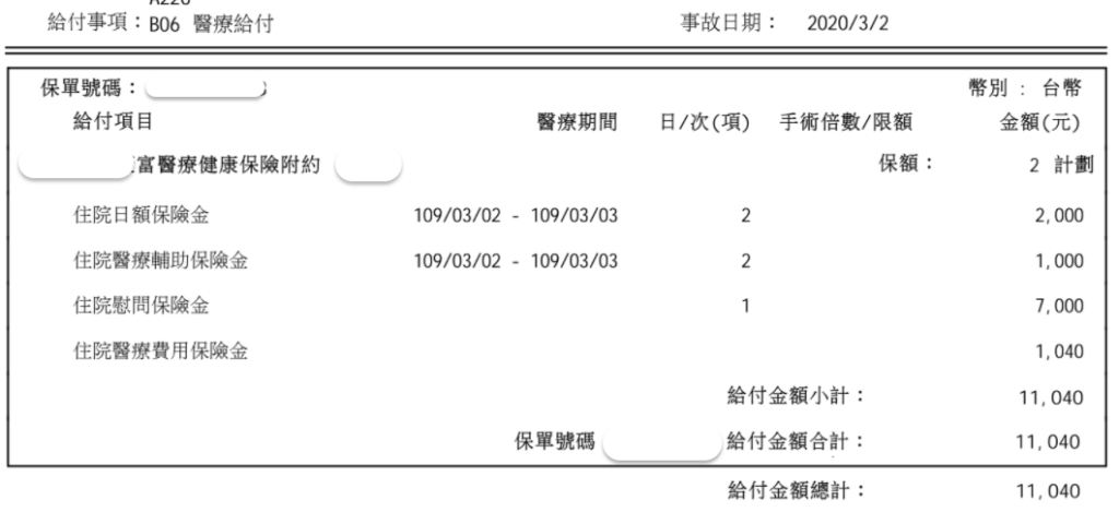跟案例 1不同在於,案例 2的客戶沒有規劃手術險的部分,所以基本上各家實支實付的理賠都剛好填補了支出的費用,因某一張保單多理賠一筆住院慰問保險金,把整體理賠額度拉高。