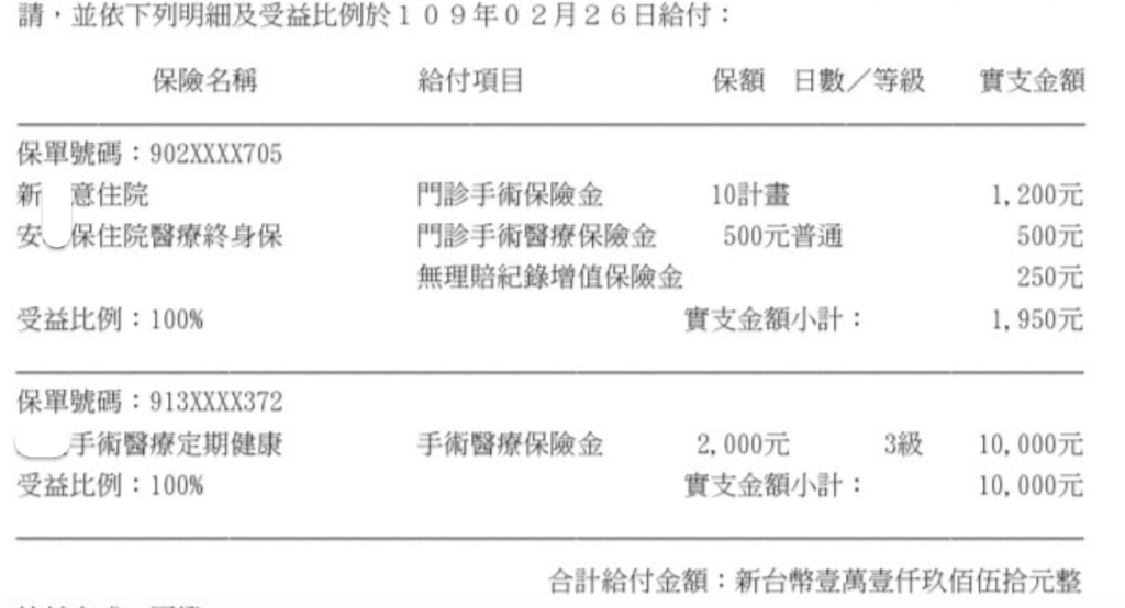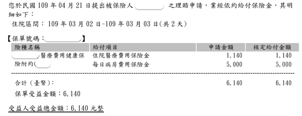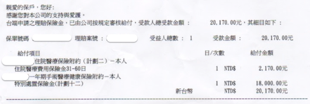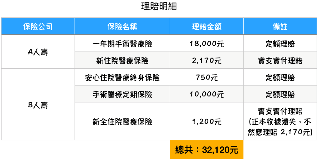 這次的理賠,實際支出的費用不多,所以實支實付僅理賠支出的額度,但定額理賠的手術險幫了很大的忙,讓被保險人能好好運用這筆理賠金做後續調養。