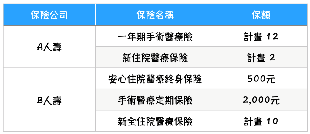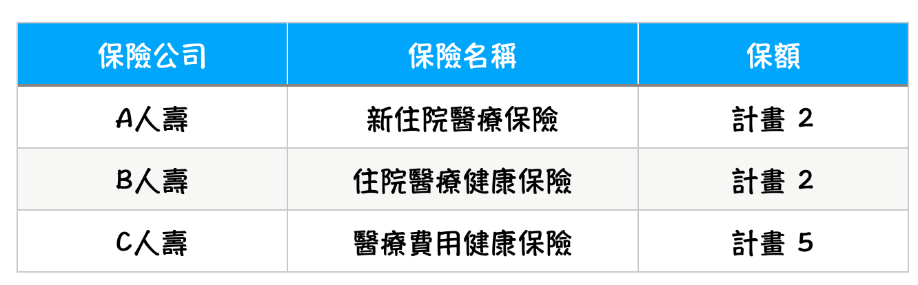 筆者健診後,發現她本身就已有終身醫療、定期實支實付與定期手術險,因此除了規劃失能險、癌症險、重大傷病險外,筆者幫客戶再規劃另一張副本實支實付和手術險來加強醫療的保障。