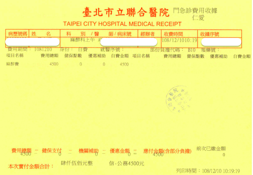 保戶也因為第一次做大腸鏡檢查的過程,實在太難過了,所以保戶第二次選擇用麻醉的方式(健保不給付),自費 4,500元的麻醉費。