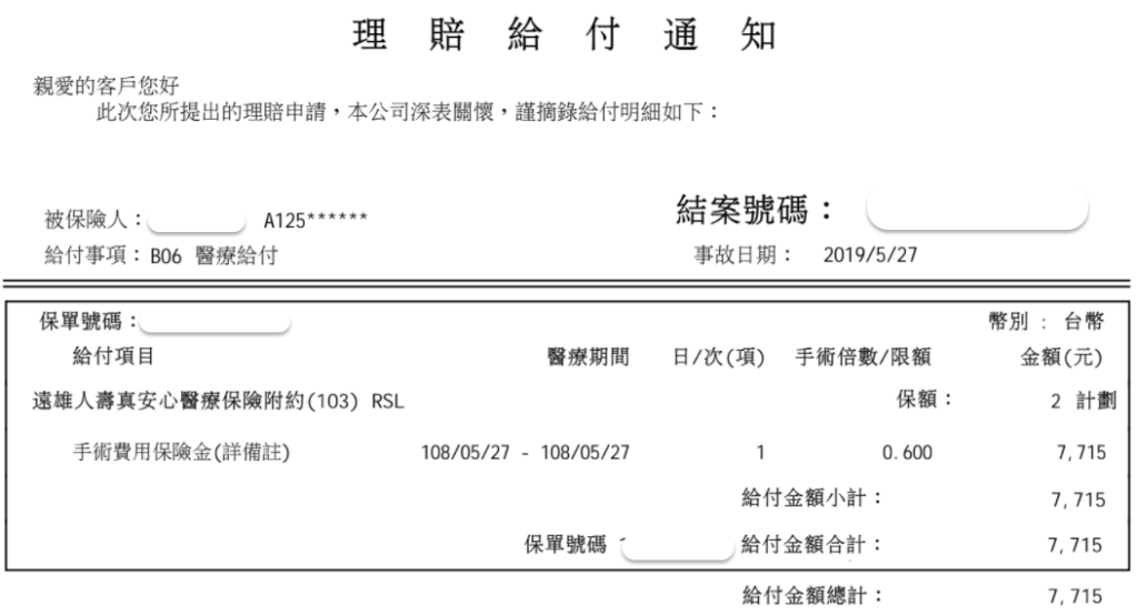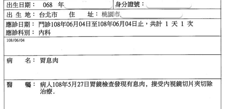 直到 2019年保戶去做例行性的健康檢查,發現胃有息肉,且因為手術中使用到較多的耗材,總共自費 7,115元。