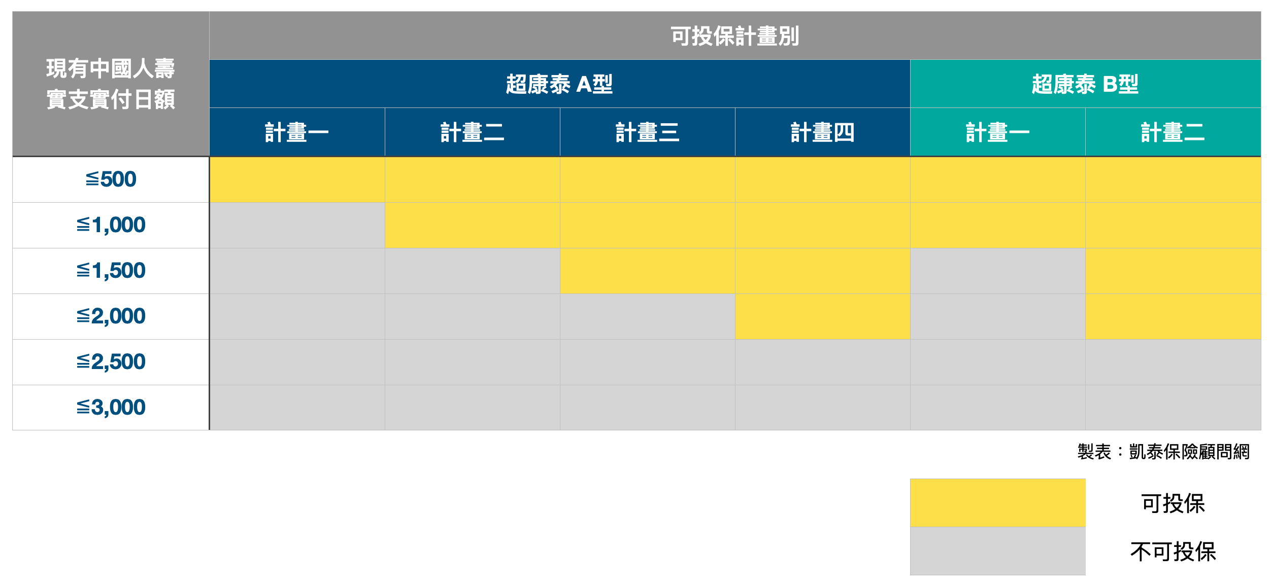若你在中國人壽的現有實支實付,累積住院日額只有 500元,那你可以買最低自負額的超康泰;相反地,住院日額越高,就只能買越高自負額的超康泰。
