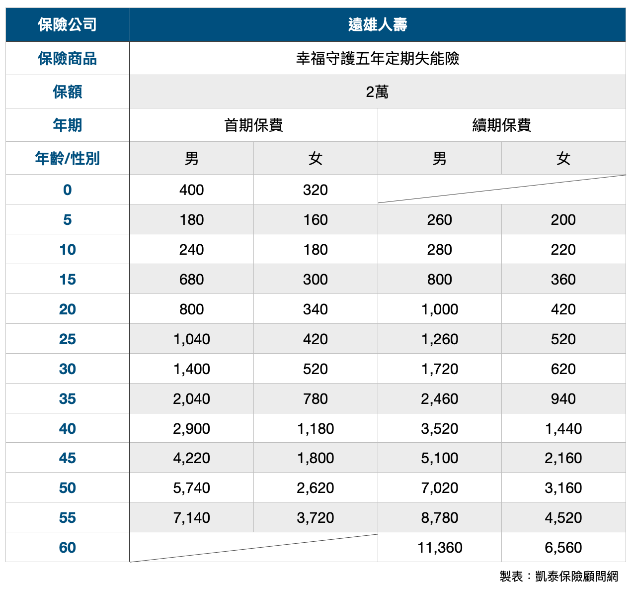 不過遠雄人壽的超好心失能險最高給付是 50年,至少可以填補幸福守護 30年後不給付的缺口。