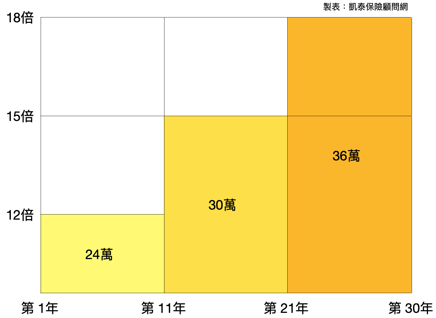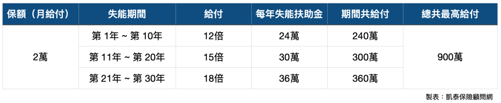 上圖以保額 2萬(月給付 2萬)做計算,失能期間在第 1年 ~ 第 10年,每年給付 24萬;失能期間達第 11年 ~ 第 20年,每年給付 30萬;若不幸失能期間長達第 21年 ~ 第 30年,每年給付 36萬。