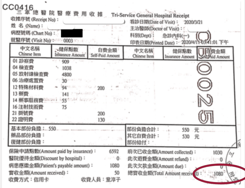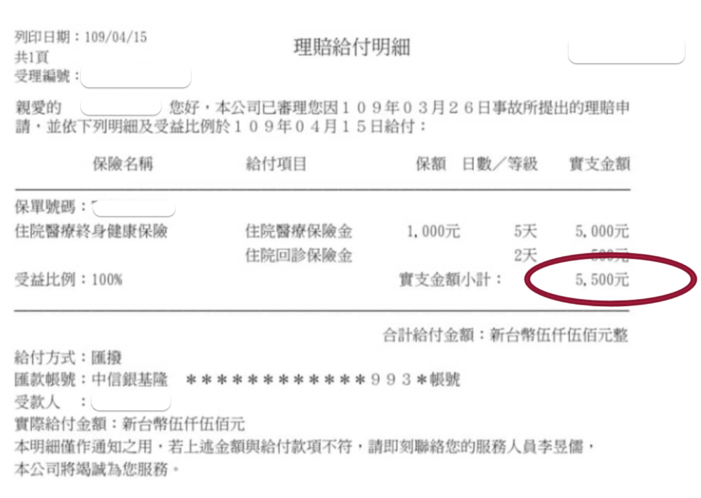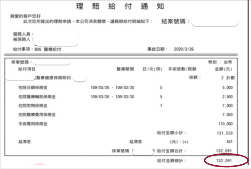 實際住院五天,收據費用總計 132,820元;因工程師的家人在長庚醫院工作,可享有家屬六折優惠,故實際支付費用為 81,552元。