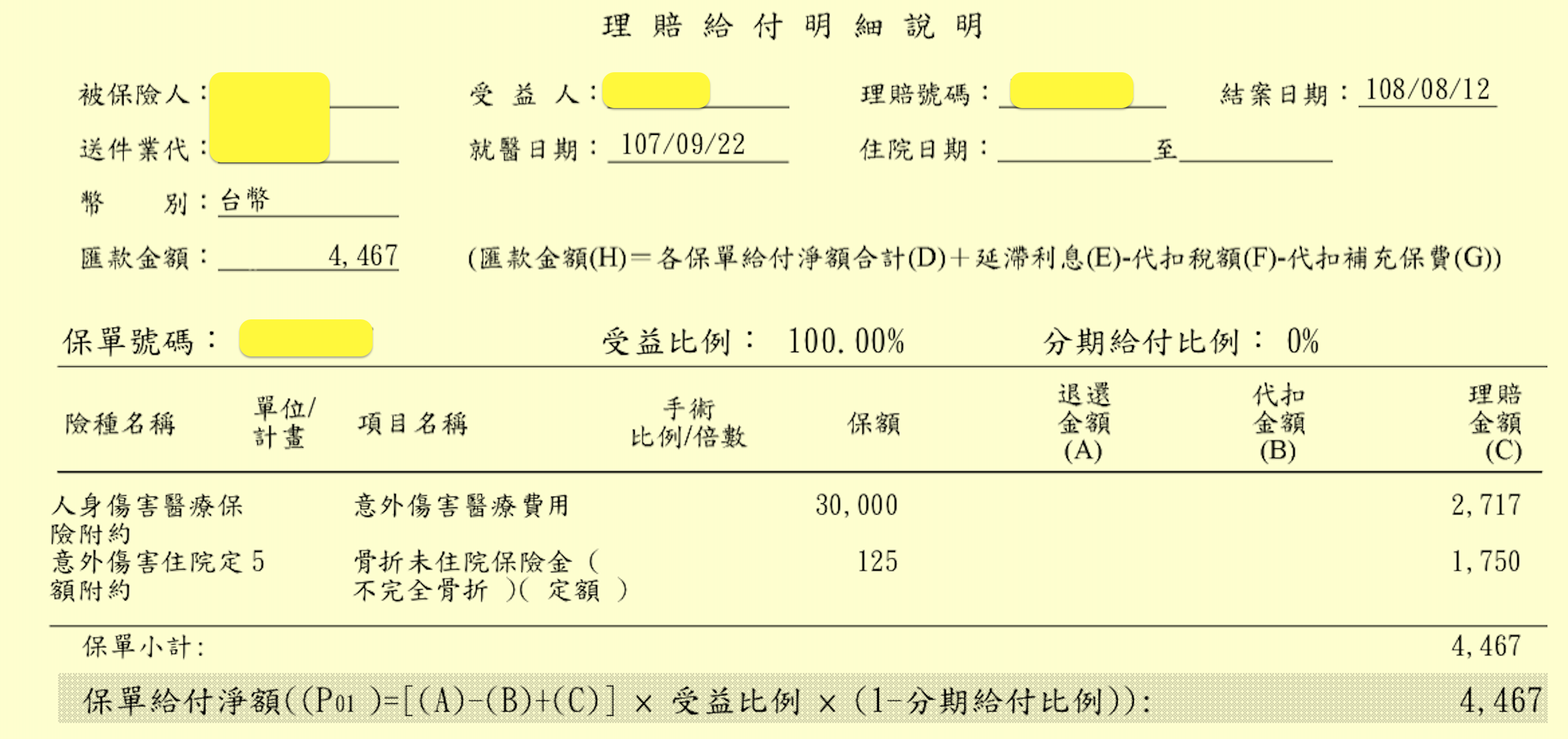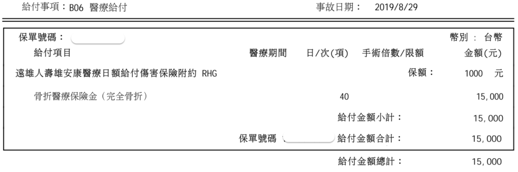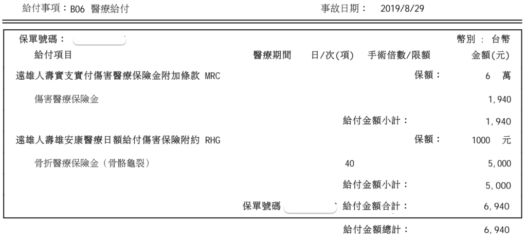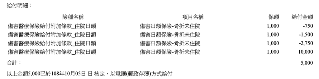 兩家保險公司都分別理賠了兩筆保險金,分別是骨折未住院與實支實付的部分,共10,282元,如下圖。