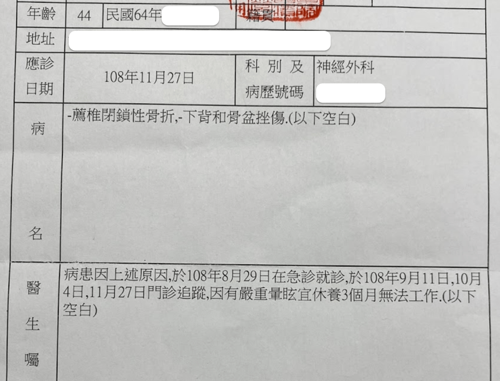 44歲女性走樓梯跌倒,屁股撞傷,醫師診斷為「薦椎閉鎖性骨折、下背和骨盆挫傷」。