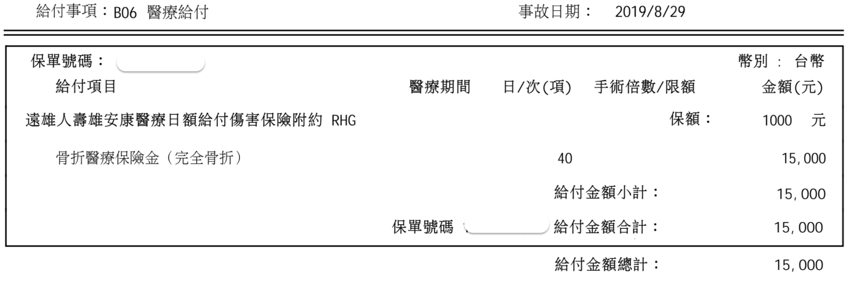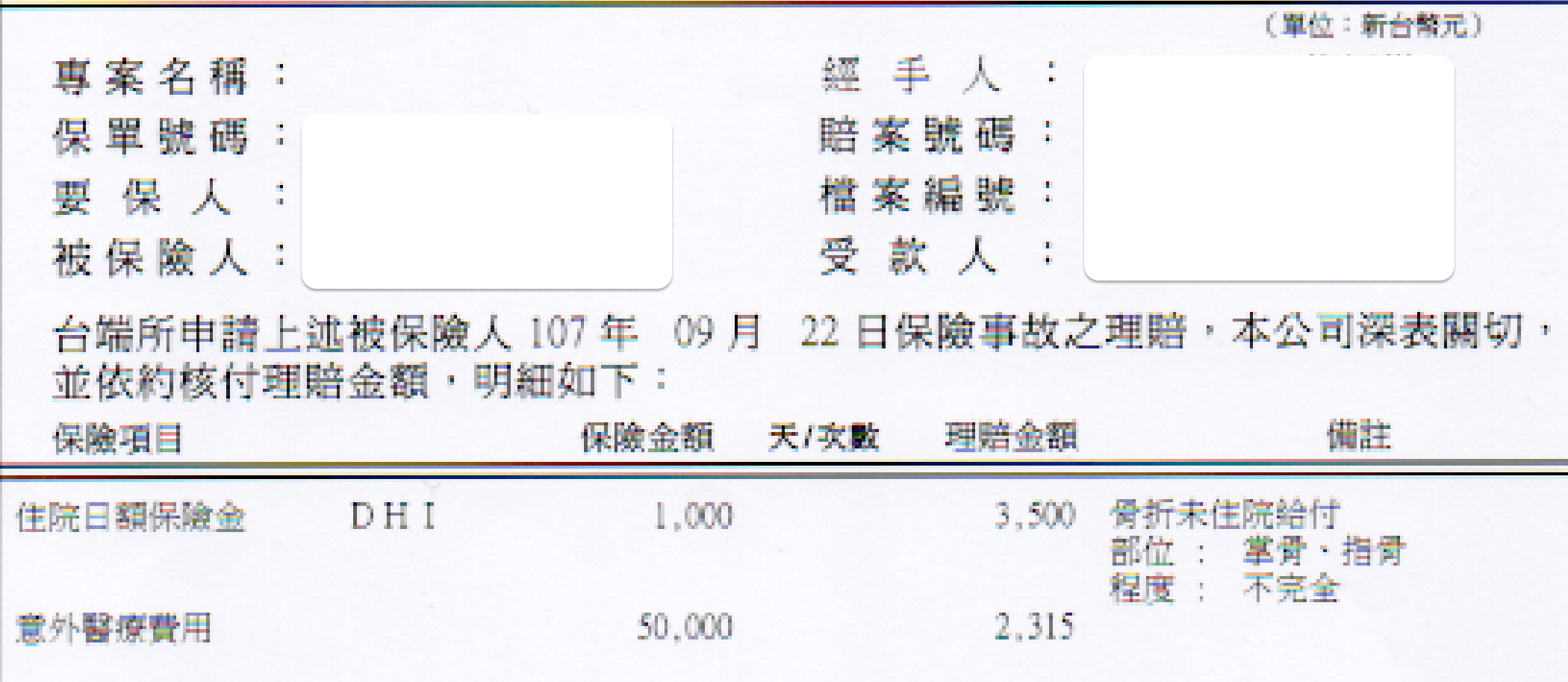 將理賠資料與 X光片送給保險公司後,兩家保險公司都以「不完全骨折」來計算理賠金額。