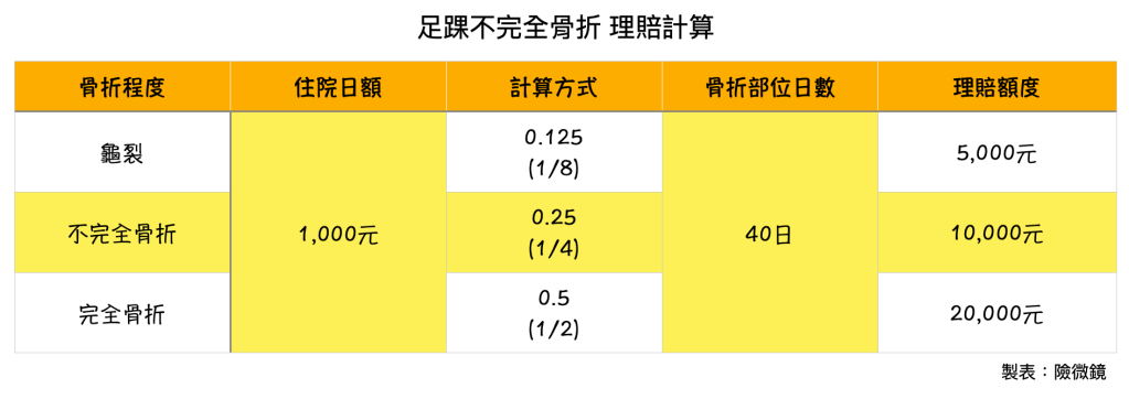 理賠額度的計算:住院日額 x 骨折程度 x 部位日數。