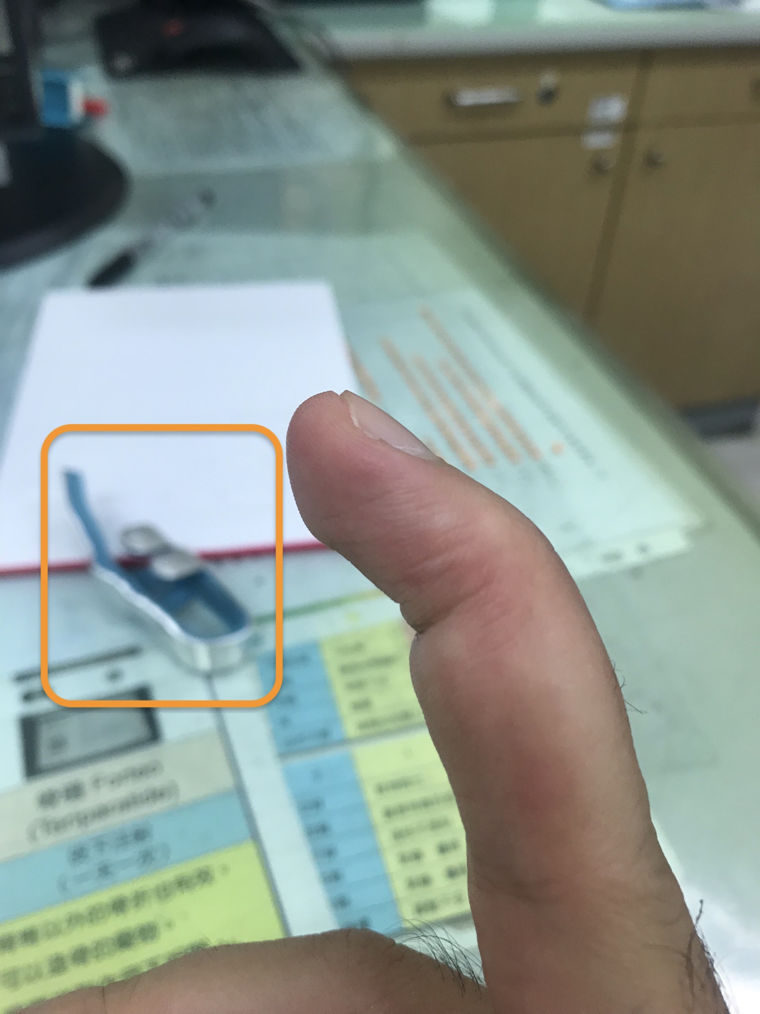 隔兩日才受不了到西醫的骨科診所掛號,雖然 X 光片看不出明顯的骨折或龜裂,但醫師研判是閉鎖性骨折,醫師還建議用護具(橘色框)固定讓手指維持伸直的狀態,有助於傷口癒合。