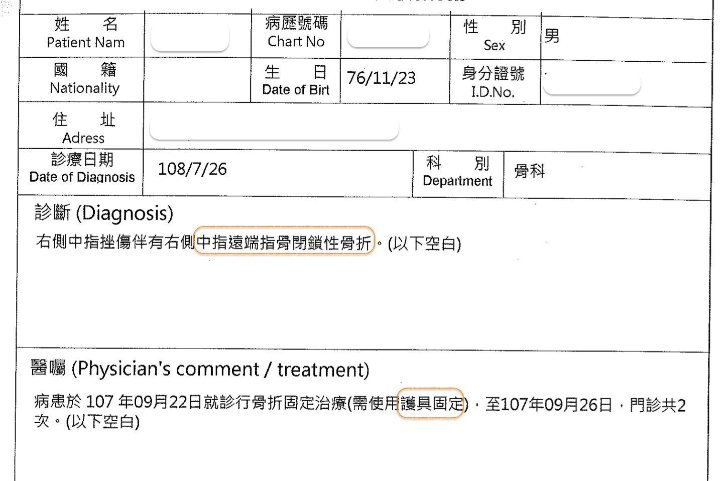 這位保戶跑了一家西醫診所、一家中醫診所、一家大型醫院分別去看手指的狀況,雖然沒有做特別的治療,不過光是掛號費也花了上千元。