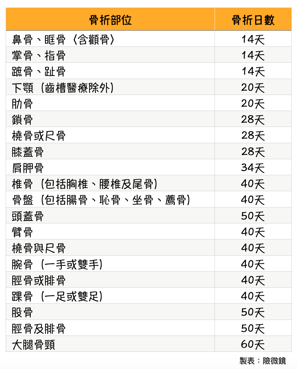 如右表骨折部位,從末梢端最易骨折的指骨、趾骨,或跌倒所致的屁股端薦骨,甚至是頭蓋骨都是保障範圍。