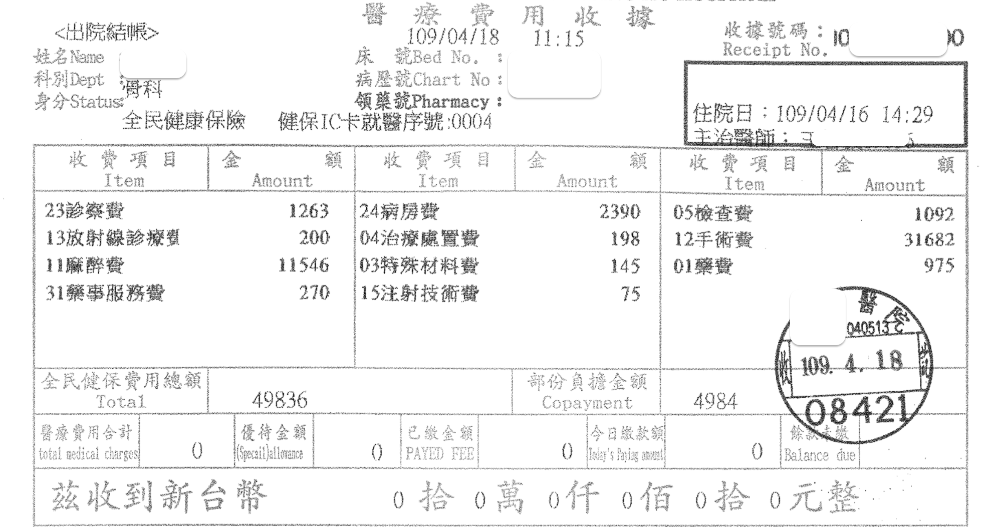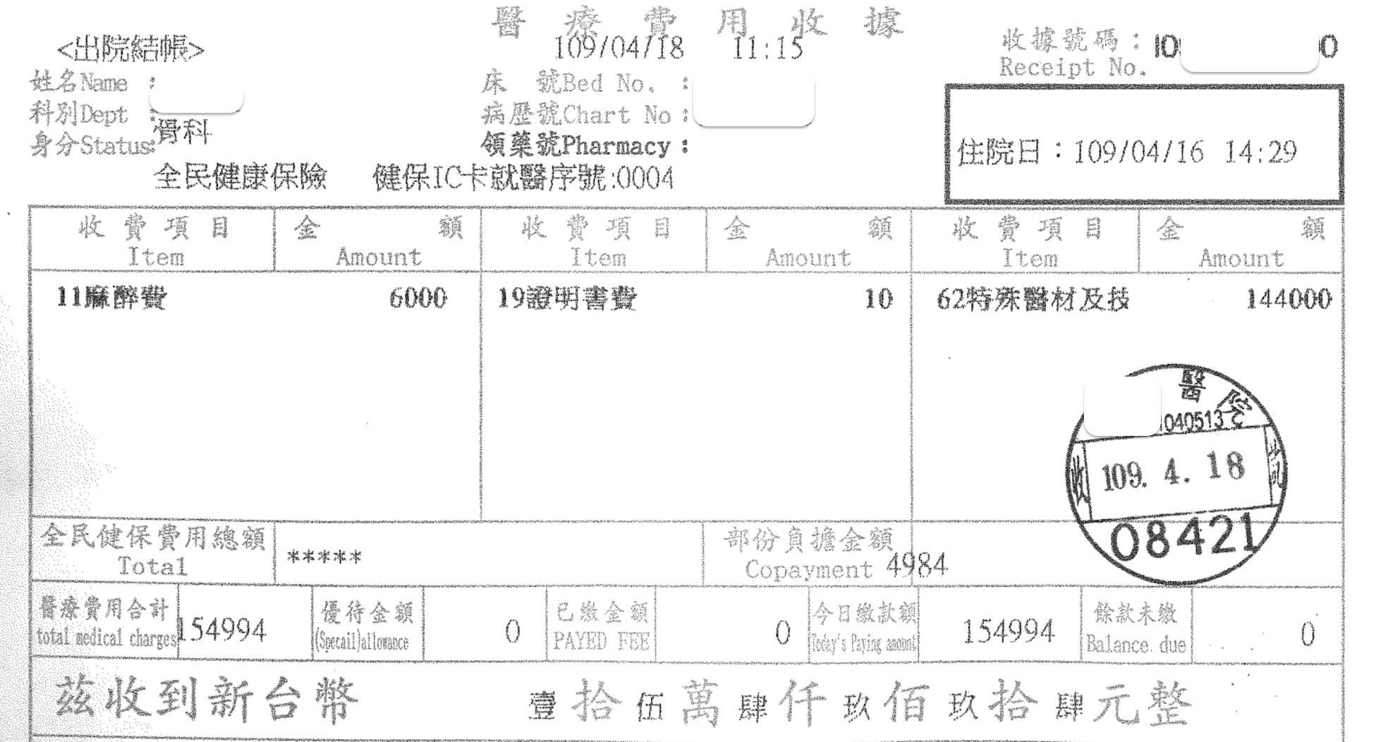 此次的旋轉肌袖手術因採用關節鏡的微創手術,健保給付很少,民眾需自費的額度較高,總共醫療費用約 15萬,而微創手術的醫材費用 144,000元,佔了整體支出費用的95%,大大凸顯實支實付的重要性。