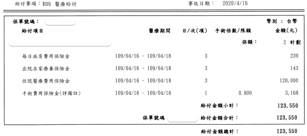 上圖的住院日額、出院療養金和手術費用,都僅理賠保戶實際支出的部分,故理賠金較少。