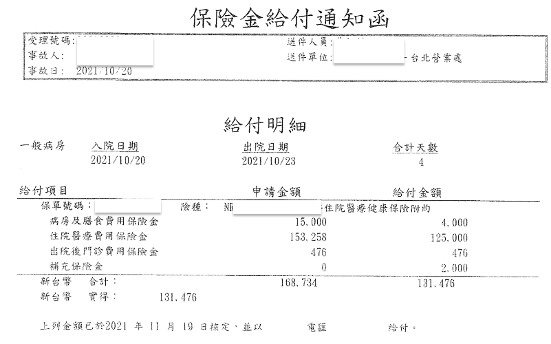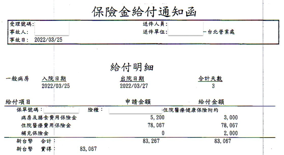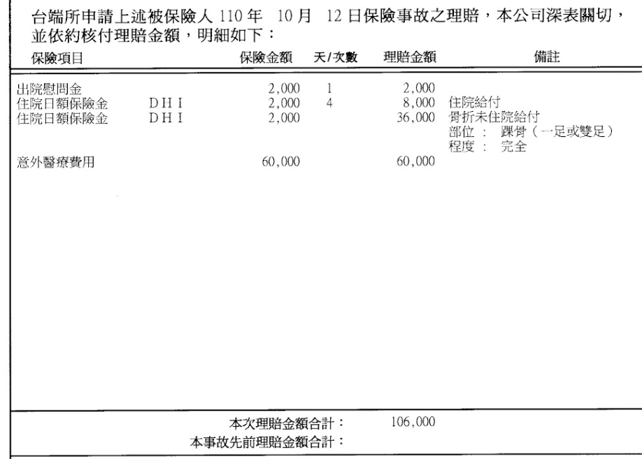 以上是三家保險公司的理賠明細,若再加上團體保險的理賠,總共理賠金是 452,504元。