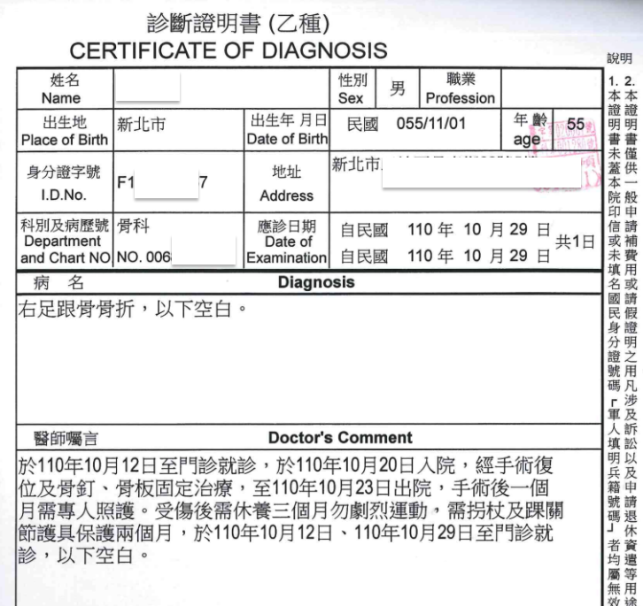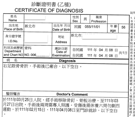 即便是這麼嚴重的骨折,住院天數也只有四天而已,出院後的單腳生活相當不易,上下班無法開車通勤,只能勉強騎摩托車,晚上還會痛醒,也要定期的復健,幾乎要三個月以上才能恢復正常生活。