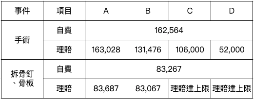 綜合以上此次骨折的事故,兩次住院手術,總共自費 245,831,總共理賠金 619,258元。
