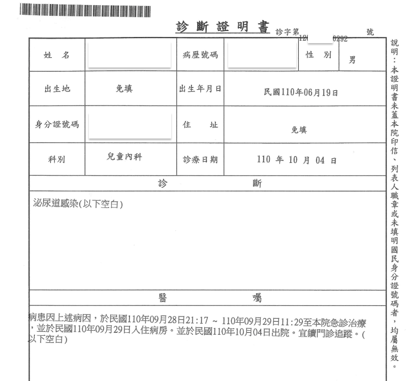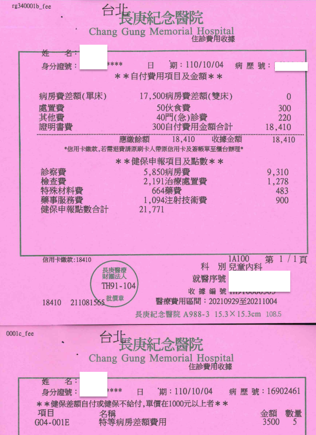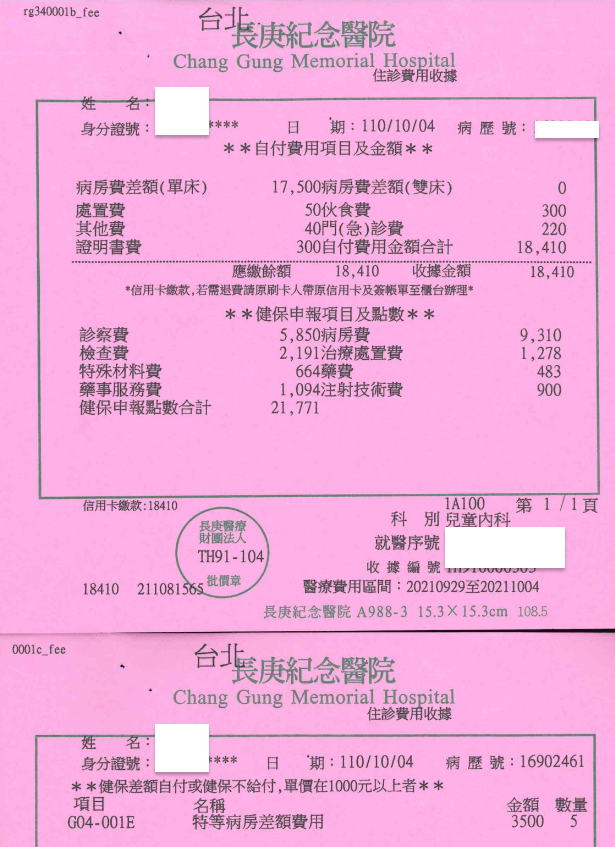 未滿一歲的小男生,因泌尿道感染發燒住院,父母兩人都是在知名企業擔任軟體工程師,住院期間 2021 年是新冠肺炎的感染爆發期,住院的風險相當高,因此毫不猶豫直接申請特等單人病房。總共的醫療費為 18,410 元。