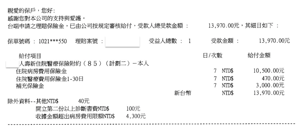 保戶投保兩張醫療實支實付,總理賠額度為 39,240 元(13,970 + 25,270)。