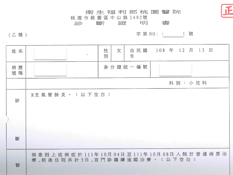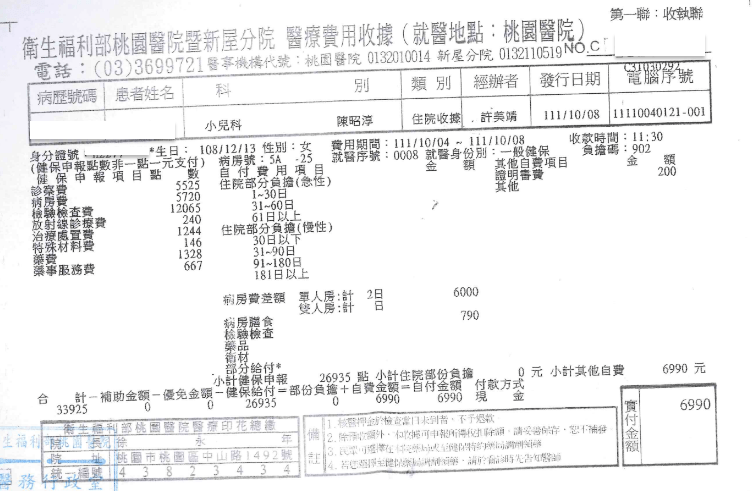 三歲的小女生,因支氣管炎兩個月內住院了兩次,父親為警察、母親為家庭主婦,在住院期間也是新冠肺炎的高峰期,病房幾乎排滿了病人,在最後兩天安排進單人病房。總共的醫療費為 6,990 元。