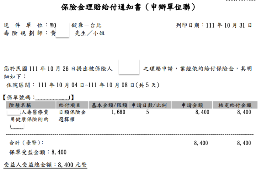保戶投保兩張醫療實支實付,總理賠額度為 18,400 元(10,000 + 8,400 )。