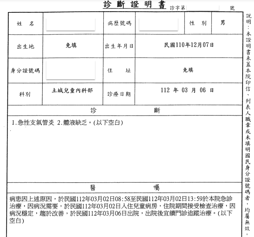 剛滿一歲的小男生,去托嬰中心後就反覆各種感冒,直到第三個禮拜還在流鼻水、發燒未改善,醫師認為有因急性支氣管炎與脫水建議住院治療,雖然已過了新冠疫情高峰,醫院的病房仍全滿,五天的住院都只能待在健保三人房,總共的醫療費不到一千元。