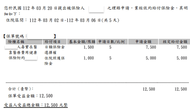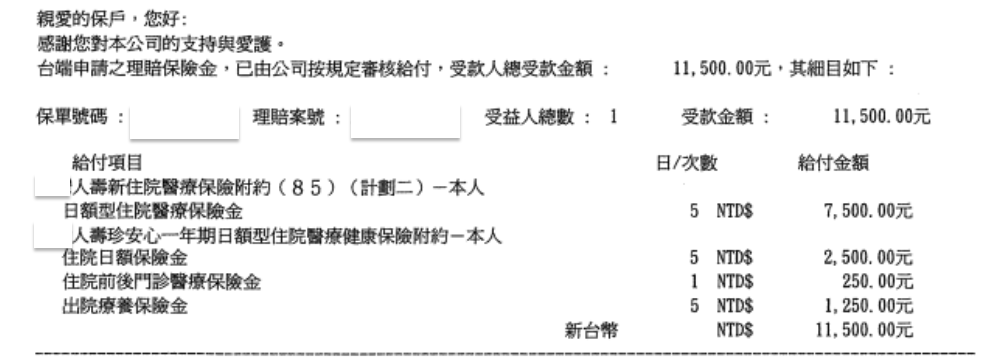 保戶投保兩張醫療實支實付,總理賠額度為 24,000 元(11,500 + 12,500)。