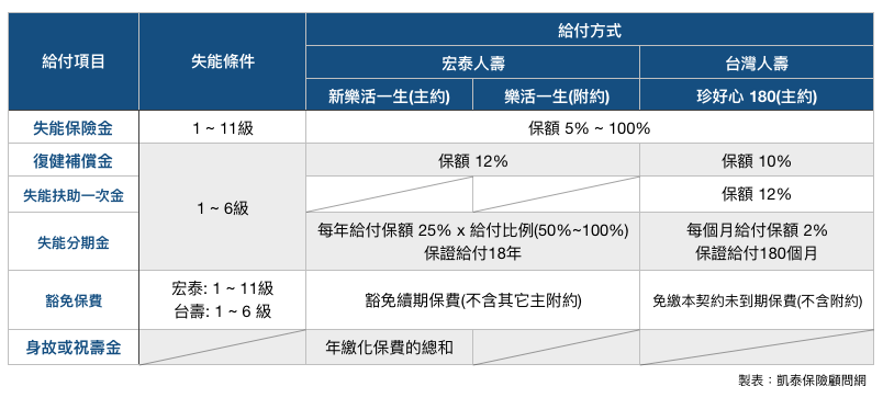 宏泰人壽這兩年像是黑馬一般,出了很多非常有競爭力的保障型商品,當然失能險也不例外,新樂活一生和樂活一生保障內容基本上都一樣,只差在新樂活是有身故給付的,而樂活一生沒有身故給付。